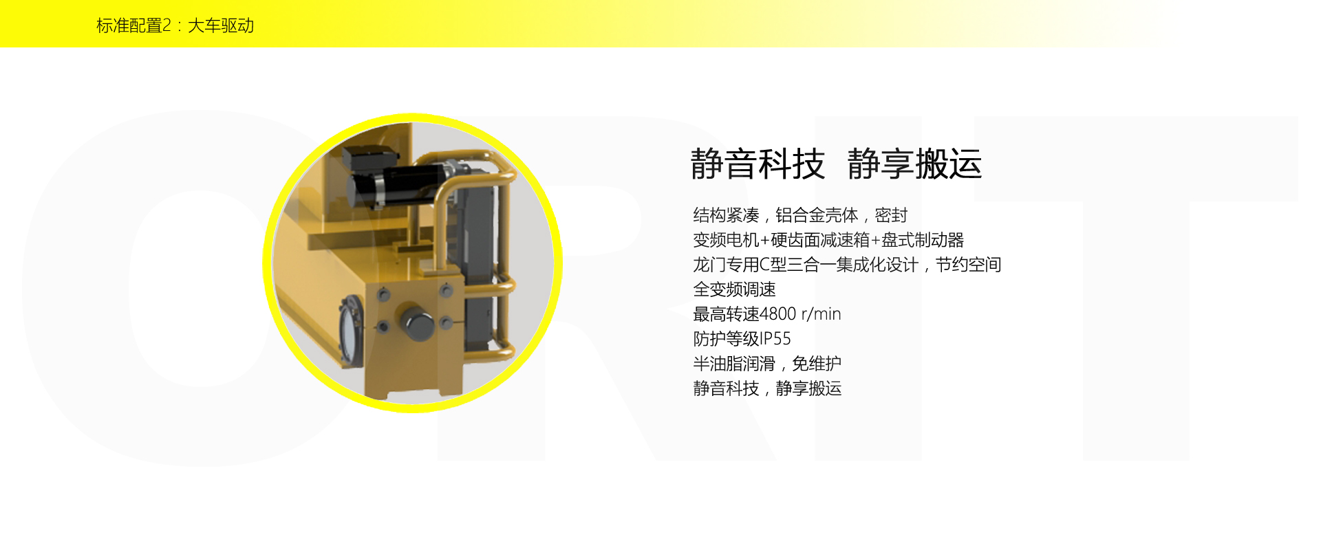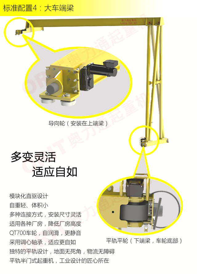 产品名称:半门式起重机 优化设计,结构紧凑 变频控制,运行平稳 实时安全监控,确保吊运安全 龙门吊专用C型驱动,节约空间 平轨设计,地面无障碍 美观大方,视野开阔,便于物流 标准化配置,让性能无比稳定 适用于12.5t以下额定载荷 标准配置1:起升机构 颠覆传统,自成一体 低净空设计 柔性驱动,内应力小,传动效率高 重级制电机,接电持续率60%ED 行走变频无极调速,运行平稳 自调试电磁盘式制动器,可靠,防尘 2160N/mm² 高强度镀锌钢丝绳,免维护 全周型导绳器,防松绳 全系标配安全监控系统 标准配置2:三合一驱动 静音科技,静享搬运 结构紧凑,铝合金壳体,密封 变频电机+硬齿面减速箱+盘式制动器 龙门专用C型三合一集成化设计,节约空间 全变频调速 最高转速4800 r/min 防护等级IP55 半油脂润滑,免维护 静音科技,静享搬运 标准配置3:电控系统 安全随心掌控 智能安全监控器 计算起升机构剩余安全工作时间 累计起升工作时间 累计超载次数 累计起升电机启动次数 起升电机过热保护及报警 刹车片厚度报警 ... ... 远程通讯 施耐德电气元件 航空插座接口 IP55防护等级 标准配置4:端梁 多变灵活,适应自如 模块化直驱设计 自重轻、体积小 多种连接方式,安装尺寸灵活 适用各种厂房,降低厂房高度 QT700车轮,自润滑,更静音 采用调心轴承,适应更自如 独特的平轨设计,地面无死角,物流无障碍 平轨半门式起重机,工业设计的匠心所在